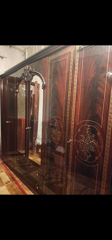 - Трёхстворчатый шкаф с центральным зеркалом. Высокий глянцевый фасад под красное дерево, декоративная золотая инкрустация, металлические ручки, нижние выдвижные ящики.