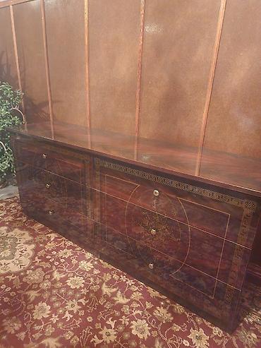 - Комод -широкая полированная столешница, фронт с узорной золотой гравировкой и круглыми ручками.