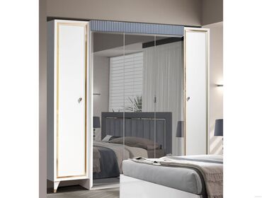 - Шкаф-центральные зеркальные створки и две белые боковые двери; верхняя декоративная планка в сером рифлёном исполнении, тонкие золотистые вставки по периметру фасадов.