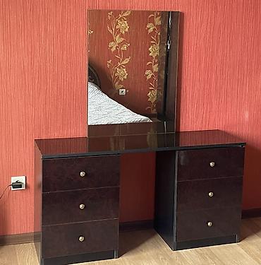 - Камод с большим прямоугольным зеркалом. Две тумбы по 3 выдвижных ящика каждая; широкая столешница для косметики и аксессуаров.