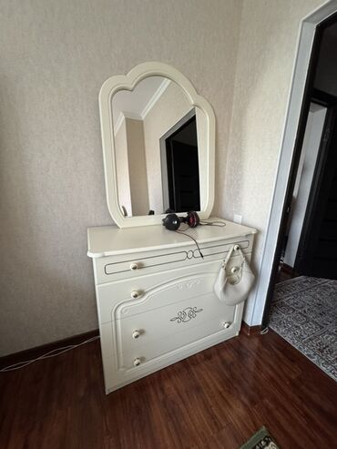 - Комод с зеркалом: 4 выдвижных ящика на роликовых направляющих, большое фигурное зеркало на столешнице.