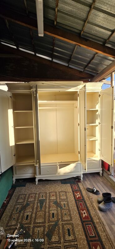- Внутри: центральное отделение под плечики (штанга), по бокам — секции с полками.