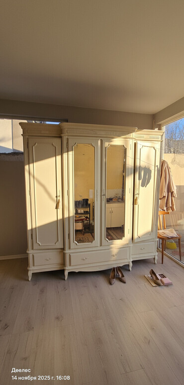 - Гарнитур гармонично смотрится в спальне, гостиной или гардеробной, обеспечивает много места для хранения и визуально расширяет пространство за счёт зеркал.