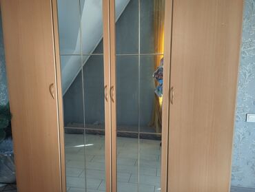 - Трёхстворчатый шкаф с двумя зеркальными дверями по центру и глухими боковыми створками. Классические фасады, декоративная раскладка на зеркалах.
