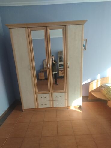 - Трёхстворчатый шкаф с зеркальными центральными дверями. По бокам — глухие створки; удобные вертикальные ручки. Внизу — три выкатных ящика. Подходит для хранения одежды: секции под плечики и полки.