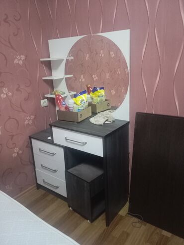 - Туалетный столик с большим круглым зеркалом. Слева блок из трех выдвижных ящиков, сверху — еще один широкий ящик. Открытая ниша и выкатная тумба на колесиках. Сбоку — узкая распашная секция. Дополнительные навесные полочки у зеркала.