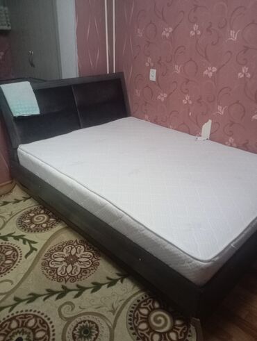 - Кровать двуспальная с высоким мягким изголовьем, основание под матрас. На фото — матрас стандартного размера.