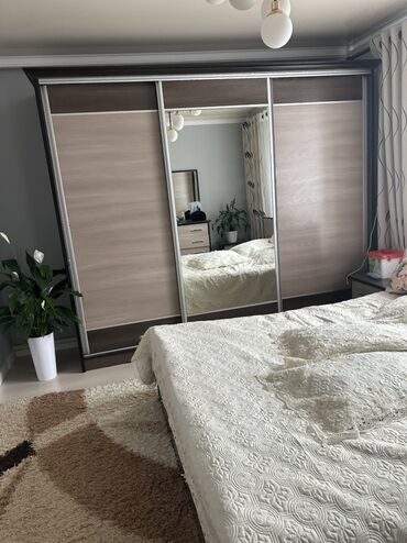 - Шкаф-купе трехдверный: центральная дверь с полноразмерным зеркалом, крайние — ламинированные панели под светлое дерево; алюминиевые направляющие.