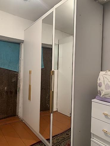 Спальный гарнитур, современный дизайн, цвет — белый с золотистыми ручками.