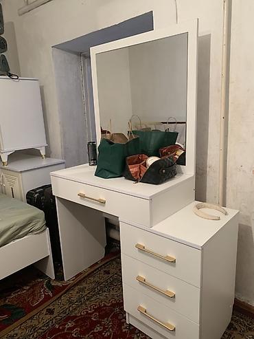 - Туалетный столик с большим прямоугольным зеркалом, выдвижным центральным ящиком и тумбой из 3 ящиков.