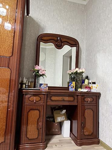 - Туалетный стол с большим зеркалом в массивной раме. Столешница с бортиком, три выдвижных ящика и два распашных отделения для хранения косметики и аксессуаров.