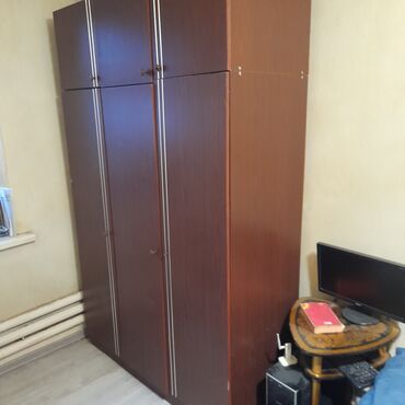 - Шкаф распашной, высокий, в классическом стиле. Три секции с вертикальными декоративными планками, сверху антресоли. Корпус из ЛДСП темного древесного оттенка, фурнитура под металл. Подходит для хранения одежды и белья.
