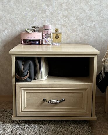 - Тумба/приставной столик с открытой нишей и вместительным нижним выдвижным ящиком.