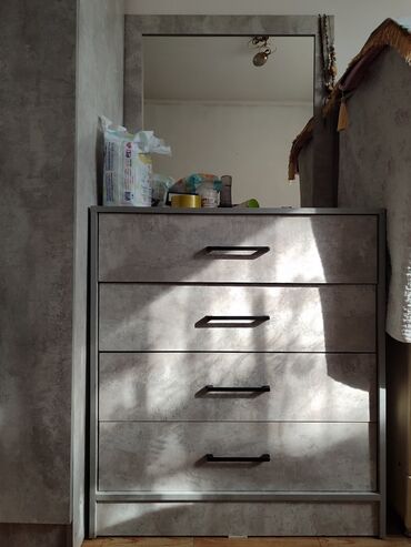 - Комод на 4 выдвижных ящика с крупным зеркалом над столешницей. Ручки в едином стиле с шкафом.