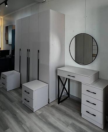 - Туалетный стол с выдвижным ящиком, боковой тумбой из трех ящиков и опорой в стиле лофт; круглое зеркало.