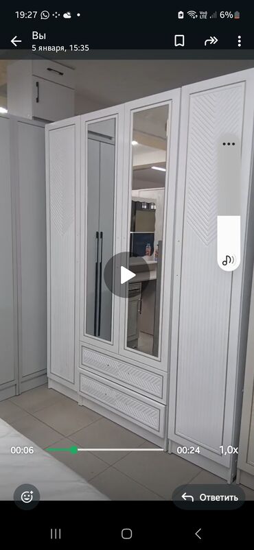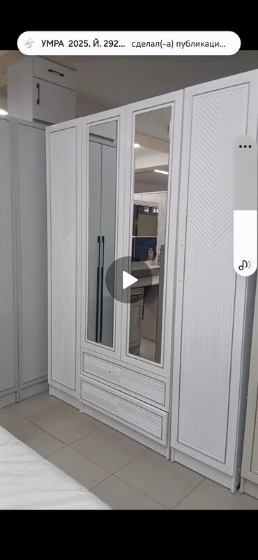 - Трёхдверный шкаф-купе/распашной с двумя большими зеркалами по центру и декоративными филёнками. Внизу — два вместительных выдвижных ящика, высокие вертикальные ручки.