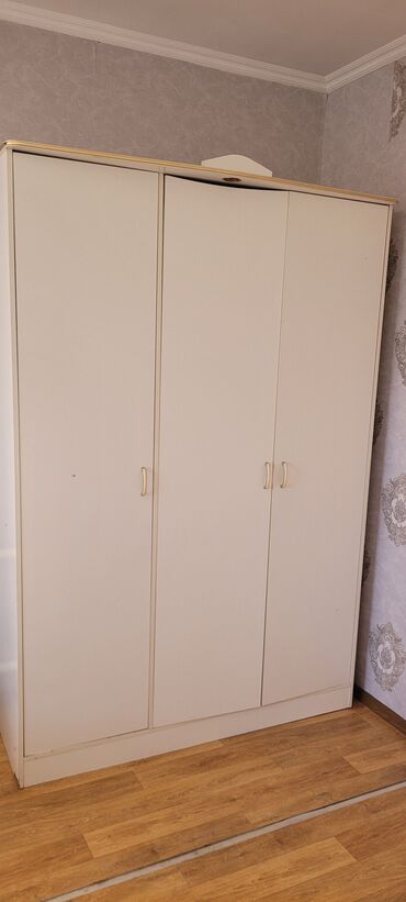 - Трёхдверный шкаф: левая секция с полками, правая — отделение для вешалок с перекладиной; верхняя полка по всей ширине.