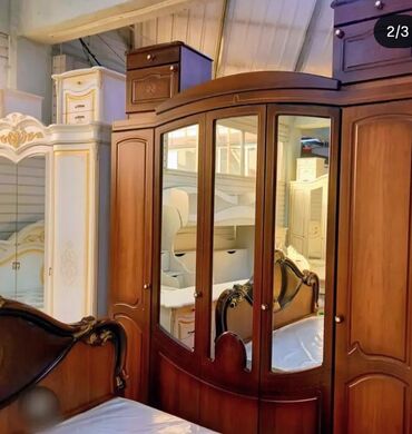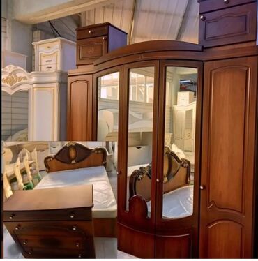 Классический гарнитур для спальни из древесины тёплого орехового оттенка с глянцевой полировкой и резными декоративными элементами. Состав комплекта: - Двуспальная кровать с изогнутым изголовьем и...