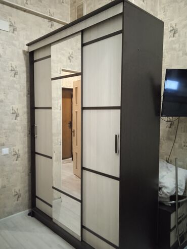 - Шкаф-купе 3-дверный с центральным зеркалом. Раздвижные двери на направляющих, длинные металлические ручки. Внутри предусмотрены секции под вешала и полки (комбинированное хранение).