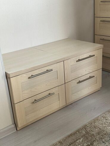 - Тумба/низкий комод из двух секций с четырьмя выдвижными ящиками, подходит как прикроватная лавка/тумба у стены.