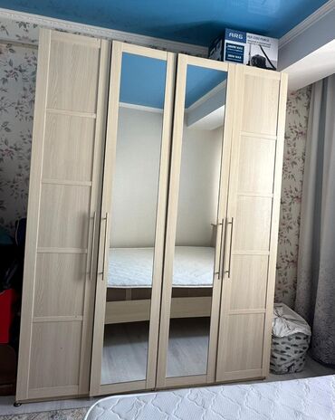 - Шкаф-купе распашной на 4 двери: две центральные двери с большими зеркалами в полный рост, боковые фасады с декоративными филёнками; длинные металлические ручки.