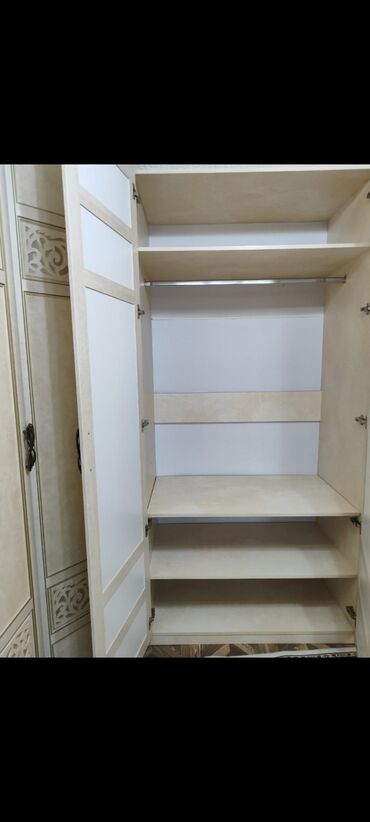 - Угловой платяной шкаф-купе распашного типа на пять секций: створки с фигурными вставками, внутри полки, отделение с перекладиной для плечиков, нижние и верхние просторные ниши.