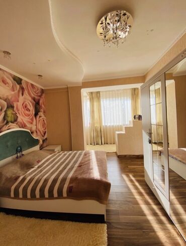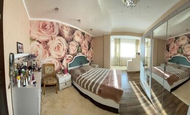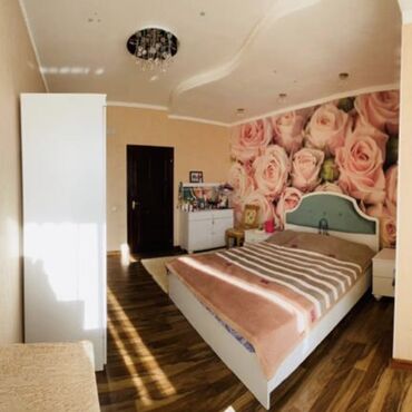 Спальный гарнитур в современном стиле (декор под дерево + белые фасады, зеркальные элементы). Состав комплекта: - Двуспальная кровать с высоким мягким изголовьем (белая обивка, стёжка). Корпус в от...