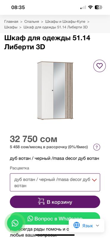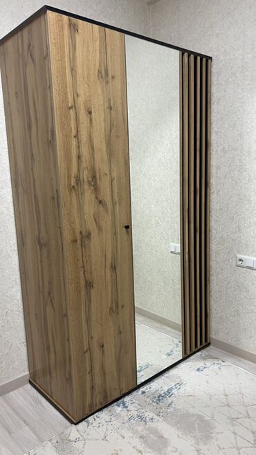 - Двухстворчатый, фасады: одна створка в декоре дуб, вторая — полотно-зеркало во весь рост.