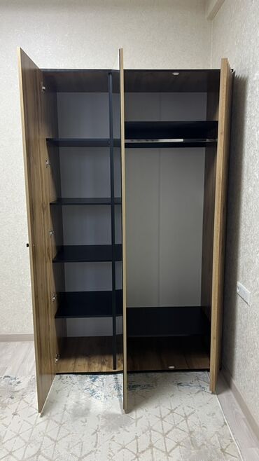- Внутри: левая секция с многоуровневыми полками, правая — отделение для одежды на штанге, верхняя полка и нижнее пространство под коробки/обувь.