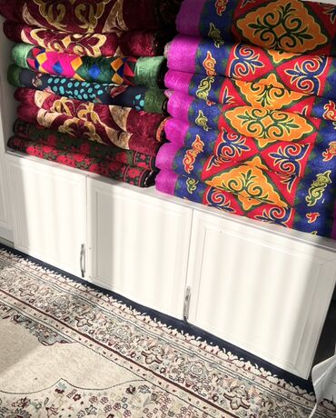 - Двуспальная кровать с мягким изголовьем. Обивка — велюр/замша светло-бежевого цвета с вертикальной стяжкой. Низ кровати закрытый, без видимых опор. На кровати — комплект покрывала с двумя наволочками в кремовом цвете с ажурной окантовкой.