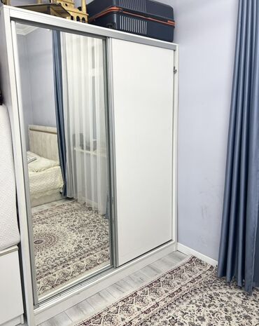- Шкаф-купе двухдверный: одна дверь с большим зеркалом во весь рост, вторая — глухая белая. Профиль алюминиевый, фасады белые. Внизу — отдельная напольная тумба/секция с распашными дверцами и металлическими ручками в одном стиле со шкафом.