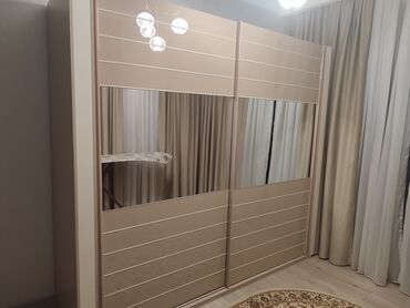 - Шкаф-купе с двумя раздвижными дверями и широкими зеркальными вставками по центру; горизонтальные декоративные рейки по фасадам.