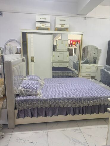 - Кровати: высокая мягкая спинка, основание под матрас, устойчивые опоры. Подходят под стандартные двуспальные размеры.