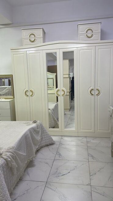 - Полноценные наборы мебели для спальни в едином стиле: кровать с мягким изголовьем, платяной шкаф (распашной или купе) с зеркалами, тумбы, комод/трюмо с зеркалом, банкетка/пуфик.