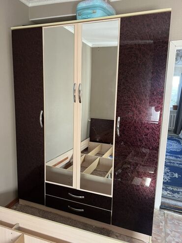 - Шкаф распашной 4‑дверный с зеркалами по центру. Внизу два выдвижных ящика, металлические ручки. Внутри — секции под одежду (полки/отделения для хранения).