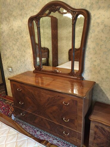 - Комод на 4 выдвижных ящика с крупным зеркалом в фигурной раме.
