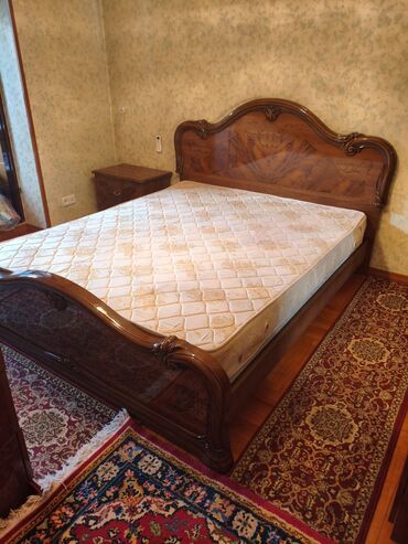 - Двуспальная кровать с изогнутым изголовьем и изножьем, резьбой и филёнками; ортопедическое основание под матрас. На фото установлен пружинный матрас стандартного размера.