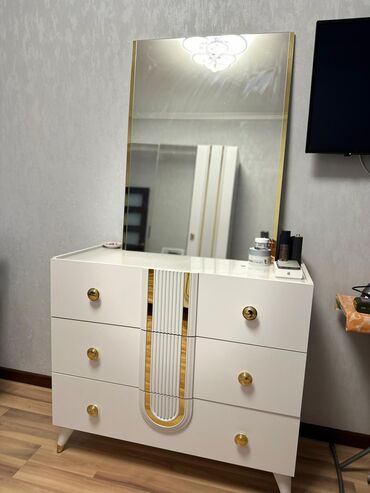 - Комод с шестью выдвижными ящиками и настольным зеркалом в раме под золото.