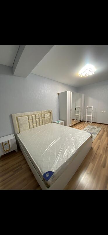 - Кровать двуспальная с мягким высоким изголовьем, обивка велюр/бархат светлого оттенка с декоративными золотыми вставками. Спальное место 1600×2000 мм (на фото матрас упакован).