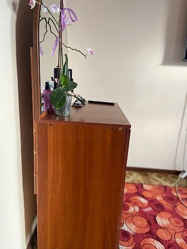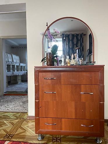 - Комод с 4 выдвижными ящиками и трюмо: большое полукруглое зеркало, верхняя поверхность удобна для косметики и аксессуаров. Ручки — металлические, опоры — цилиндрические.