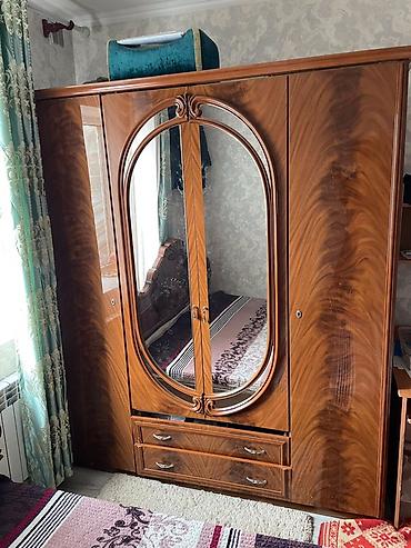 - Шкаф трёхдверный с центральными зеркальными створками, декоративными накладками и двумя выдвижными нижними ящиками. Боковые секции с полноценной дверцей; внутри — секции для вешалок и полки (по фото).