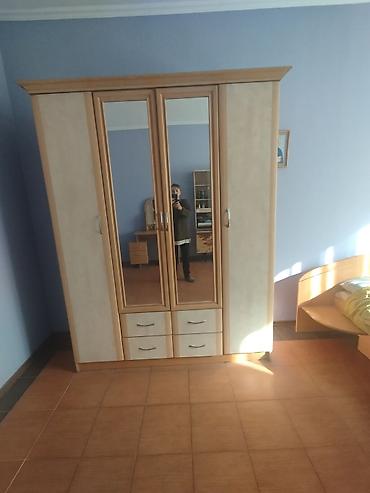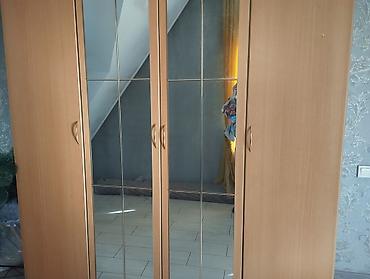 - Шкаф платяной 4-дверный с зеркалами по центру: две распашные секции по краям, центральные зеркальные двери, внутри полки и штанги для вешалок; внизу три выдвижных ящика с металлическими ручками.