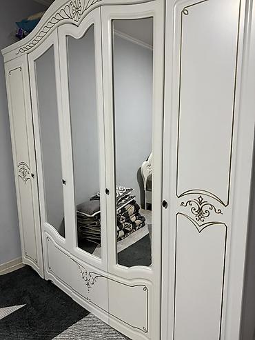 - Шкаф распашной 5-дверный: три центральные двери со встроенными зеркалами во весь рост, боковые глухие фасады. Внутри предусмотрены отделения для вешалок и полки (по фото видны секции по ширине). Карниз с фигурным декором.