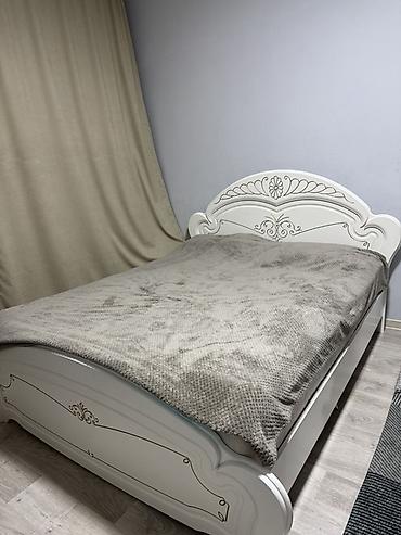 - Кровать двуспальная с резным изголовьем и изножьем, плавные линии, декоративные профили и золотистые элементы. Высокие боковины, устойчивое основание под матрас.
