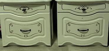 - Пара прикроватных тумб: у каждой по два выдвижных ящика с фигурными фасадами и металлическими ручками.
