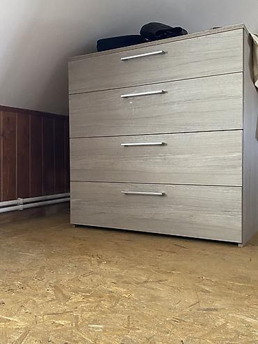 - Комод на четыре выдвижных ящика с длинными металлическими ручками. Гладкие фасады, глубокие ящики для белья и одежды.
