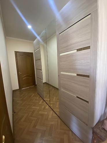 - Шкаф-купе с тремя раздвижными дверями, две — с декоративными горизонтальными вставками под дерево, одна — зеркальная во всю высоту для визуального расширения пространства и примерки. Вместительная система хранения.