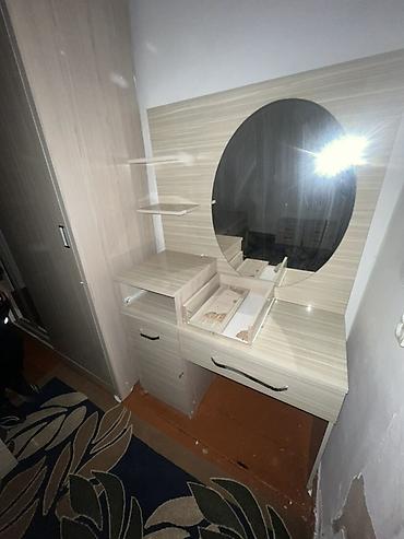 - Туалетный столик с большим овальным зеркалом, выдвижными ящиками и открытыми полками для косметики и аксессуаров.