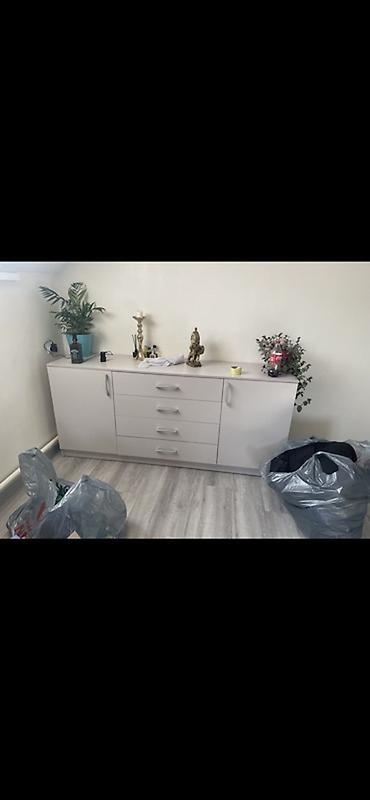 - Комод/тумба с центральным блоком из четырёх выдвижных ящиков и двумя закрытыми боковыми отделениями с полками. Удобные горизонтальные ручки.