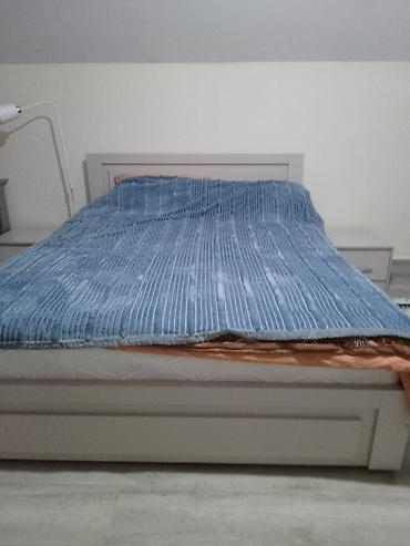 - Двуспальная кровать с высоким прямоугольным изголовьем и низким основанием. Жёсткое рамочное оформление, лаконичный дизайн.